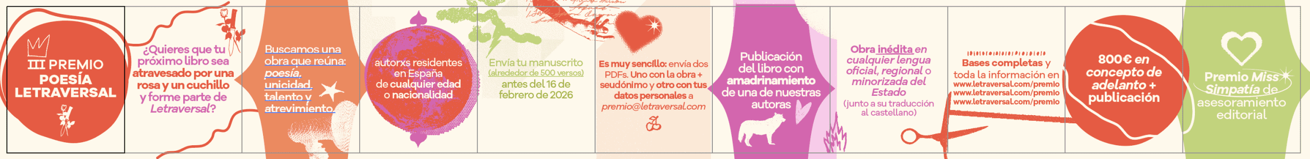 Anunciamos la convocatoria de la tercera edición del Premio de Poesía Letraversal, certamen que nace con el propósito de promocionar la creación poética desde todos sus márgenes. Buscamos una obra que reúna poesía, unicidad, talento y atrevimiento. Se premiará con 800€ un texto inédito que será publicado por Letraversal y amadrinado por una de nuestras autoras.